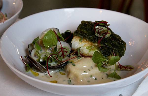 這塊自製的鱈魚乾魚排,其實主廚處理的很好,份量、鹹度、熟度、在加上覆蓋其上的香草堅果殼,帶有不經意隨流的魚汁與微嫩、卻又跟外殼有適度張力的口感,只是旁邊的蛤蠣汁似乎沒有發揮鮮甜的本份,讓醬汁平淡無奇,或許這個脫胎自義式狂水煮魚典範的結構,因少了番茄的酸,再加上過鈍的貝夏梅奶油醬,使得原本也能輕易展現討人喜愛的蛤蠣白醬,反到完美地失神落魄。
