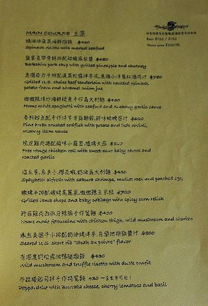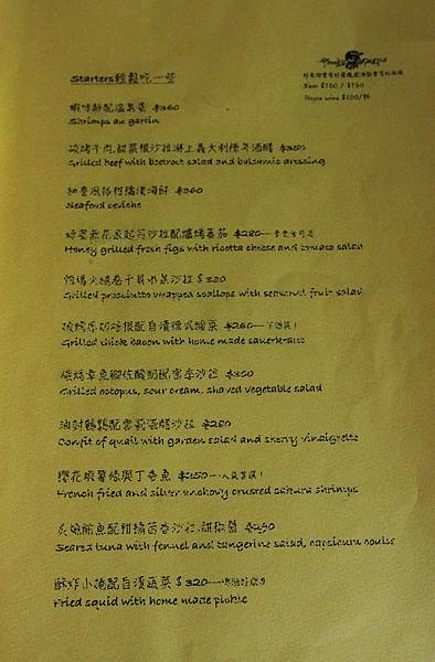 菜單,因列印時斷線嚴重,需要偵探式的推理閱讀,入座後服務人員僅來告知菜單上其中一道主菜的配菜換了,沒有解釋菜單上任何料理的內容,比如什麼是祕魯風格、什麼又是蝦味鮮配溫泉蛋 ? 但環顧其他客人(現場約有十多人)的點菜狀況,似乎沒人在意,且毫無阻礙、流暢地完成點菜,是因為來用餐的,都是粉絲而能接受餐廳的「不在意你是否好不好讀菜單」?還是反正也不太清楚在寫什麼,感覺到主要食材即可?還是以熟客居多,已熟悉菜單?還是來這裡用餐的顧客,是高雄最有包容心、最優質的客人?