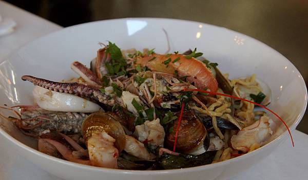 海鮮用的很彭湃,還有二隻不便宜的角蝦,只是這傢伙真的又硬又不好撥,蝦肉不多,蝦殼又刺刺黏黏,沒有開背剪腹的話,真的人想動手吃的人恐怕不多,成為提升消費價值的場面效果。「漬炒」是第一次看到,總之,就是加了鯷魚、乾辣椒一起炒,使得整盤麵看起來沙灰沙灰地,沒有特級橄欖油蒜炒得油亮明快,點這道麵是想試試最基本的炒麵功夫;提香與乳化。