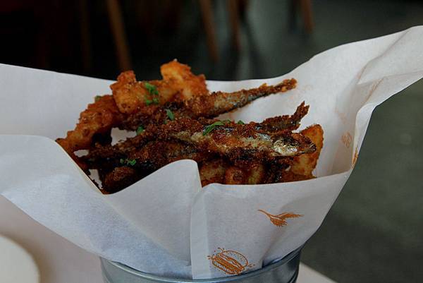 這道是其墾丁本店的招牌前菜,因此點來試試品質是否有落差,作法大同小異,都是以粉碎的櫻花蝦作為強化味道、與提出鹹鮮的關鍵食材,薯條是先蒸(或蒸烤)再裹櫻花蝦薄漿油炸,只是吃來沒有本店的酥脆,且薯條外殼厚重、略帶油耗味,若不是事先炸好再微波出餐的成品、便是一次炸太大的量,導致油溫下降太多,讓薯條在油裡泡太久(蒸好的薯條基本上會冷凍保存,可以直接炸也沒問題,但一次下太多,冰凍的薯條會讓炸油溫度下降),而影響口感。